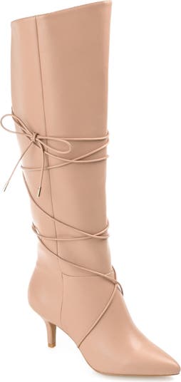 Slender ties wrap around a faux leather tall boot balanced upon a kitten heel for a svelte, elegant style.