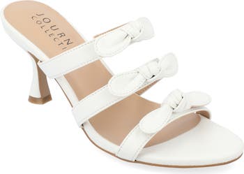 Triple straps with knotted bows sweeten a faux-leather slide sandal lifted by a curved heel.