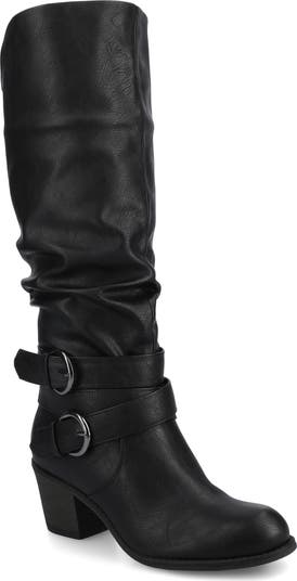 Step into trend-setting style with these buckle boots by Journee Collection. These fashionable boots feature premium faux leather uppers that rise mid-calf with slightly raised angular vamps in the front.