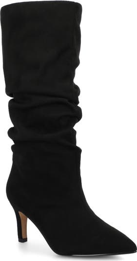 Ruched details lend depth and dimension to a knee-high boot lofted by a stiletto heel that elevates casual, everyday looks.