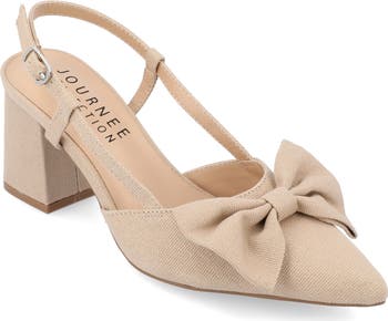 A sharp pointed toe and block heel balance a contemporary pump with a slingback strap for a breezy update to your desk-to-dinner style.