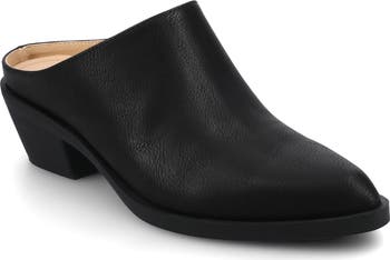 A slip-on design offers quick styling of a sophisticated mule crafted from faux leather and set on a low block heel that's easy to walk on.