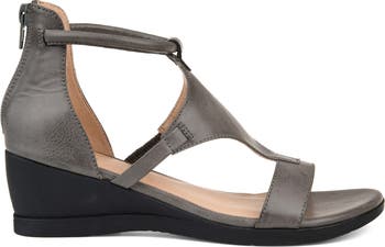 Elevate any outfit with this T-strap wedge sandal featuring a back zipper and grip sole for easy-wear comfort.