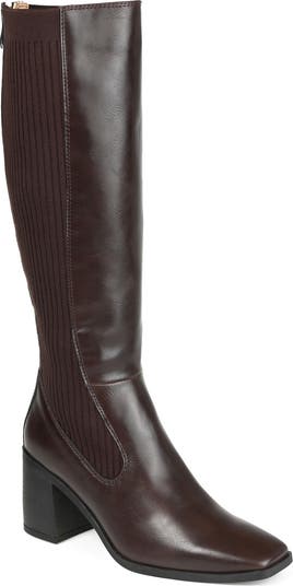 A contrasting ribbed panel offers a stretch feature for a faux leather tall boot.