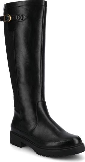 A sleek faux-leather silhouette lends a powerful statement to a knee-high boot set on a lugged rubber sole to ensure each stride is met with comfort and a secure grip.