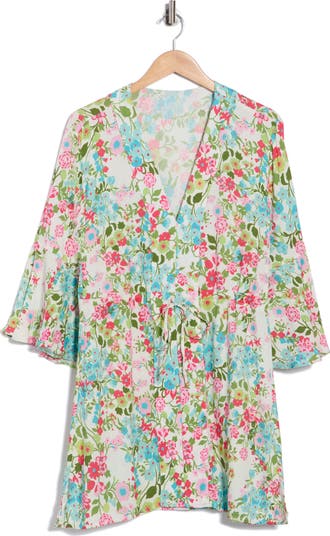 Stroll confidently from beach to boardwalk in this floral-printed cover-up caftan framed by wide bell sleeves and an adjustable drawstring waist.