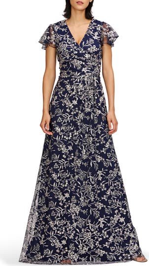 Bring elegance to your special occasion in this floor-grazing gown designed with shimmering metallic embroidery and slight sleeves.