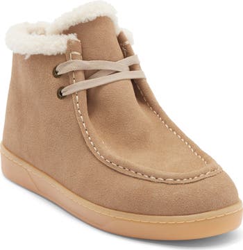 A moc-stitched toe and flexible rubber sole balance a timeless leather chukka boot outfitted with a faux-shearling lining for daylong comfort.