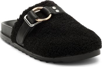 A polished O-ring buckle details the plush faux-shearling vamp of this cozy clog grounded by a grippy sole.