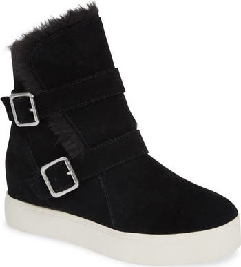 Plush faux fur peeks out from the wrapped topline of a street-chic suede sneaker featuring buckled straps and a cushy platform sole.