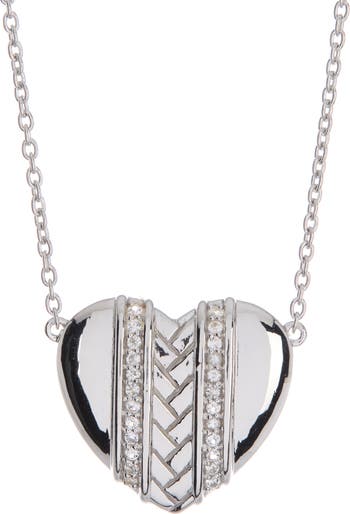 A rich texture and rows of diamonds distinguish a romantic heart-shaped pendant suspended from a dainty chain.