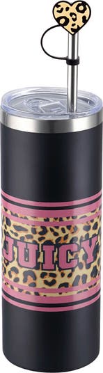 Stay chic and hydrated with this stainless steel water bottle bursting with Juicy charm and designed with a leak-resistant lid, a straw and a heart-shaped cover.