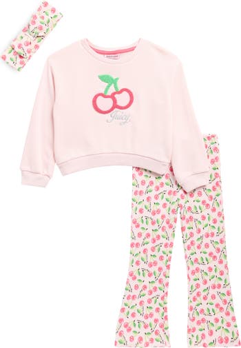 Brimming with Juicy charm, this baby-approved set features a cherry flavored crewneck pullover paired with matching leggingd snd topped with an adorable headband.