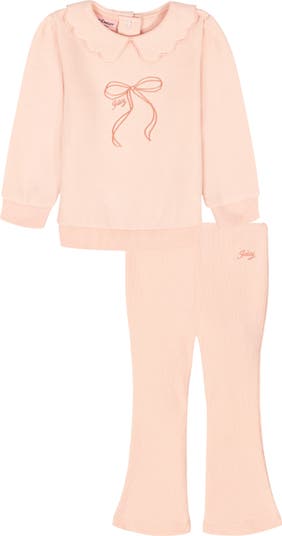 An embroidered bow adds coquettish vibes to the cuddly sweater in this cotton-blend set complete with matching flared sweatpants.
