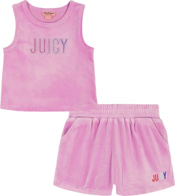 Your kiddo will lounge around in signature Juicy styling in this ultrasoft velour set featuring a tank top and pull-on shorts.