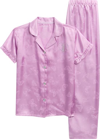Y2K dreams come true in these logo-print satin pajamas detailed with rhinestones to make your modern kid sparkle.