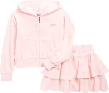 A metallic logo accross the back shimmers on an iconic kids' set that includes a zip hoodie and ruffle-tiered miniskirt made from velvetty soft velour.