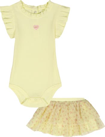 Ruffles and rib-textured knit decorate a charming bodysuit paired with a metallic speckled tulle skirt for a picture-perfect finished.