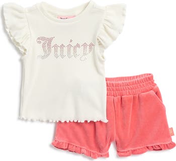 Juicy's iconic logo is done up in rhinestones on a fluttery tee paired with ruffled shorts to sweeten baby's style.
