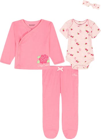 Scalloped edges, pretty blooms and Juicy's signature logo define a four-piece set for baby that makes a perfect gift to the new parent in your life.