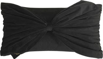 Add a glamorous statement to your space with this luxurious velvet pillow adorned with a large bow.