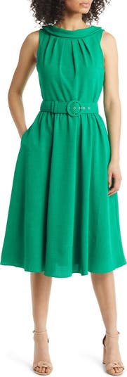 Classic charm defines this sleeveless A-line frock designed with a folded neckline and a waist-defining belt.