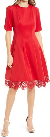 Darling puff sleeves frame this fiery red frock punctuated with a flared, lace-trimmed skirt.