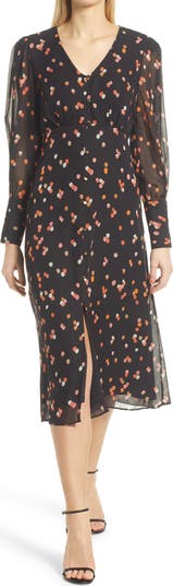 A dot-dappled chiffon dress keeps romance in the picture with a fitted bodice, covered buttons and a face-framing V-neck.