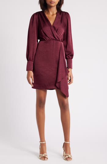 A flourishing ruffle and a surplice neckline add grace notes to a simply lovely dress crafted from textured satin in a wine-soaked hue.