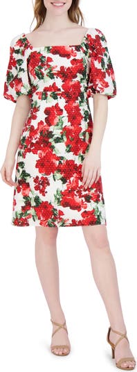 A vibrant floral print brings instant romance to a fit-and-flare cotton dress crafted with dramatic puff sleeves.