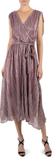 A glimmering color palette of striated stripes patterns this midi dress fashioned with a surplice neckline and sash-tied waist.
