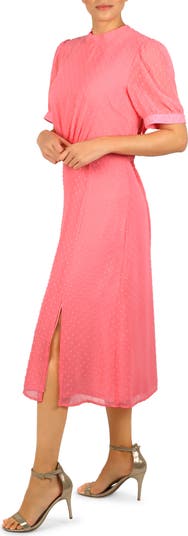 Textured dots play across the pretty pink fabric of a puff-sleeve midi dress finished with a graceful tie closure.