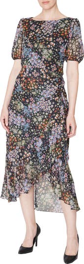 Rippled ruching shapes this flowery puff-sleeve maxi designed with wrapped-and-ruffled high-low hem.