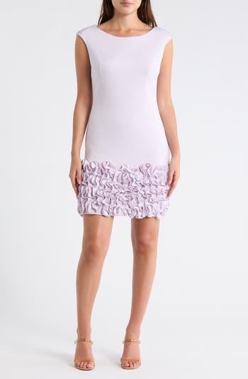 Make an elegant entrance in this fitted A-line dress finished with a wide ruffled appliqué hem.