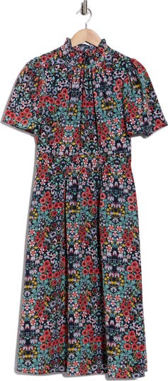 Wrap yourself in a gorgeous garden when you choose this flutter-sleeve dress, cut with a full skirt and a gracious, ruffled-edged high neck.