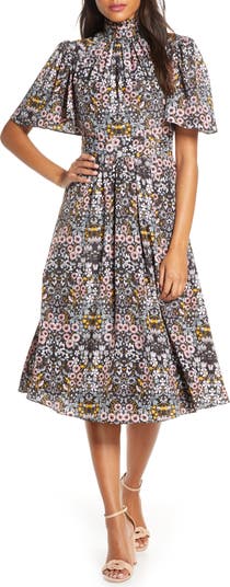 Wrap yourself in a gorgeous garden when you choose this flutter-sleeve dress, cut with a full skirt and a gracious, ruffled-edged high neck.