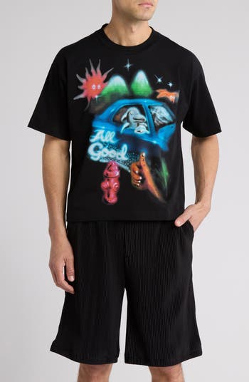 Bright colors and unexpected images bring freshness and fun to an all-cotton T-shirt that provides a dark background to let the airbrushed graphics pop.