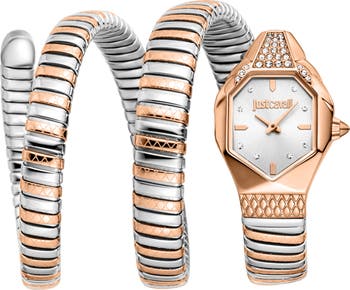 A geometric case heads this snake-inspired watch completed by a slinky wraparound bracelet, creating a captivating silhouette on your wrist.
