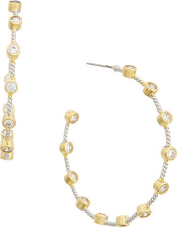 Bezel-set cubic zirconia sparkle from every angle on these slender twisted hoop earrings boasting a glossy two-tone finish.