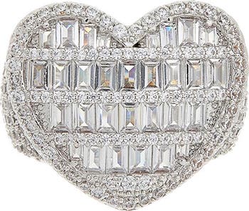 Show off glamorous sparkle with this romantic heart ring illuminated by round- and baguette-cut cubic zirconia.