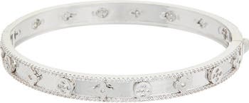 Stack on the shine with this hinged bangle bracelet traced by geometric motifs and illuminated by sparkly cubic zirconia.