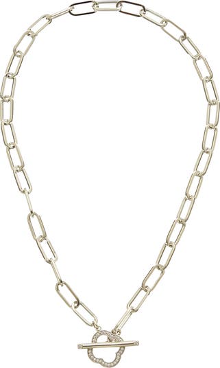 Sparkly cubic zirconia highlight the clover of a layerable paper clip–chain necklace secured by a front toggle closure.