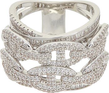 Layers of linked and straight bands covered in cubic zirconia pavé give this statement ring a glamorous, sparkling finish.
