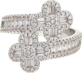 Add glamorous sparkle to your hand with this wrap ring featuring mixed-cut cubic zirconia and bold clover end caps.