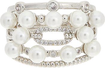 Rows of lustrous faux pearls and cubic zirconia sparkle on this multistrand ring.