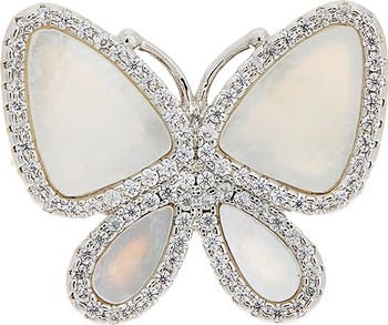 Show off whimsical shine with this elegant butterfly ring illuminated by mother-of-pearl insets and dainty cubic zirconia.