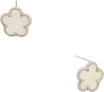 Textured frames catch the light on shimmery mother-of-pearl flower stud earrings that bring sweet shine to everyday looks.
