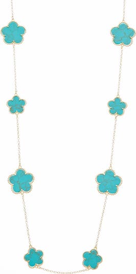 Glossy stones glimmers on clover-shaped station necklace finished in a warm goldtone plate.