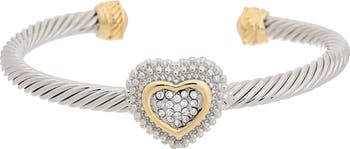 A pavé cubic zirconia heart enhances the sweet shine of this twisted cuff bracelet boasting a polished two-tone finish.
