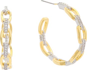A two-tone finish lends striking detail to these polished hoop earrings shaped from chain-like links and set with shimmery cubic zirconia.